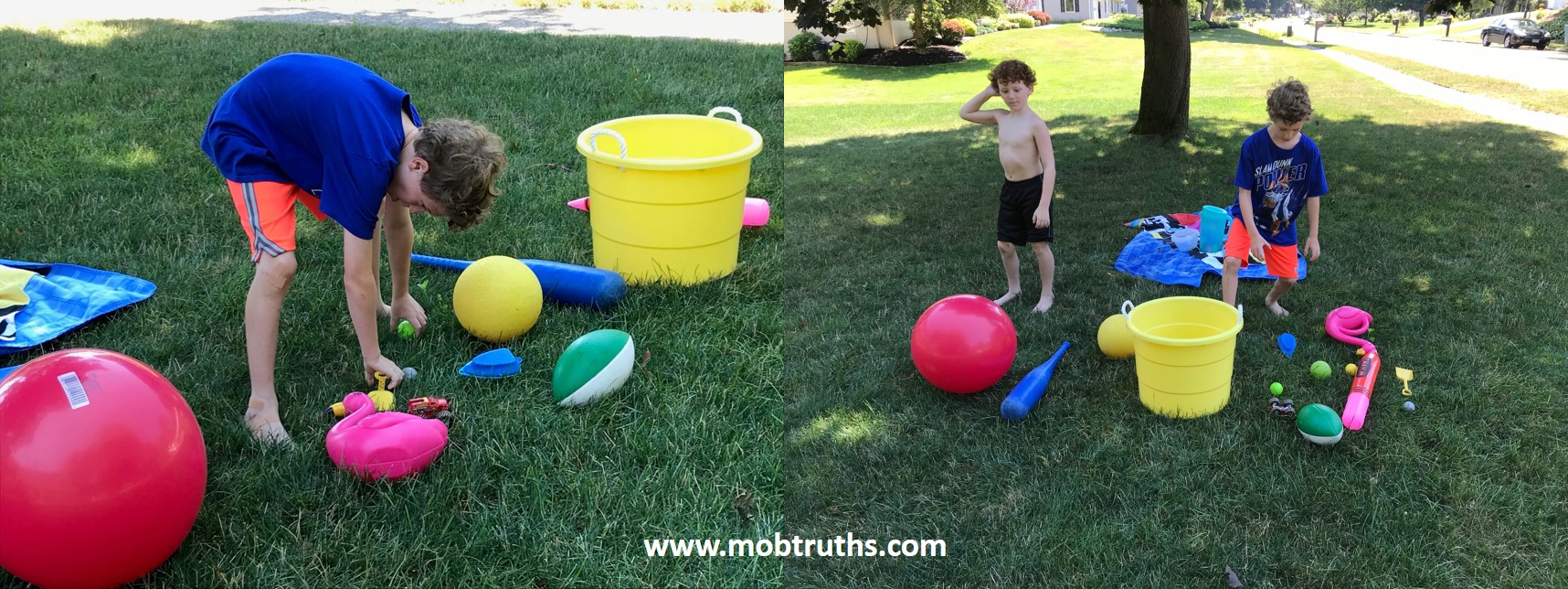 I took the week off of work to spend with my boys — a little bit of fun, a little relaxation — wait, actually, relaxation never happens for me — a lot of laughs, some yelling, some tantrums, some timeouts, and a lot of mess. We find fun in making messes sometimes — it’s liberating for the kids, and it reminds me to just go with the flow (easier when I know I’m using washable paints!). Just like a few years ago when I created a Sensory Exploration Day for the boys, I created another Sensory/Play Day this week — focused on teamwork and FUN. It was so simple to plan, relatively inexpensive to execute, and lots and lots of fun. But more importantly, during our series of activities, I didn’t once hear “Mom, I’m bored,” or “Mom, what can I do now?” I heard a lot of “Which activity is next?” and “Can we do this again?” It became the MOST AWESOME summer day, and we never even left our front yard.